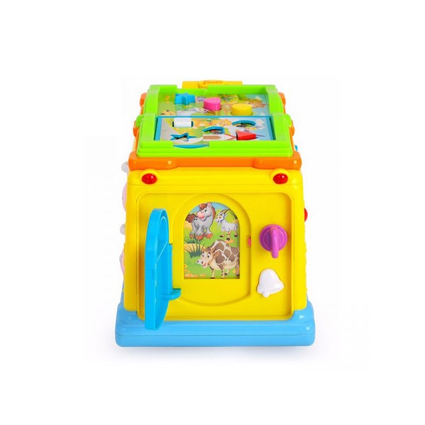 سمت دیگر، چرخ دنده هایی قرار دارد که کودک می تواند با کمی فشار، یکی از آنها را بچرخاند و باعث چرخش بقیه ی چرخ دنده ها شود.