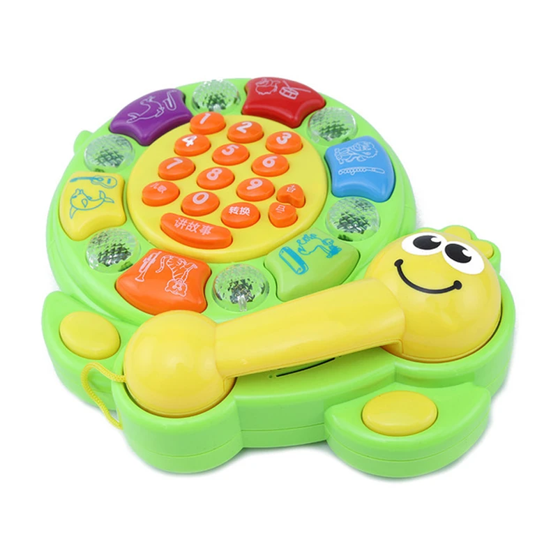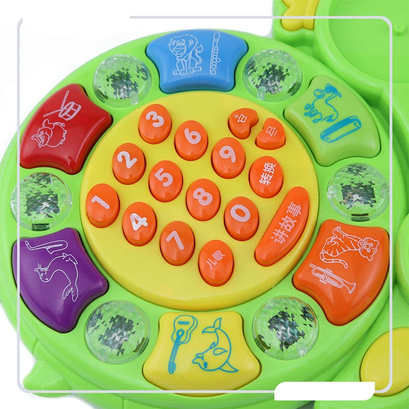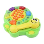 تلفن موزیکال و چراغدار لاک پشت یک اسباب بازی بسیار محبوب در دنیای کودکان است. طراحی این تلفن به شکل لاک پشت با 6 دکمه و 6 led در کنار هم می باشد. همچنین روی هر دکمه از لاک تلفن موزیکال لاک پشت شکل یک حیوان طراحی شده است. کودک با فشردن هرکدام از این دکمه ها قادر به شنیدن نام و صدای آن حیوان خواهد بود. تلفن موزیکال حلزون دارای دکمه های شماره گیری نیز می باشد. این دکمه ها علاوه بر صدای شماره گیری ، موسیقی های مختلف نیز پخش می کنند.