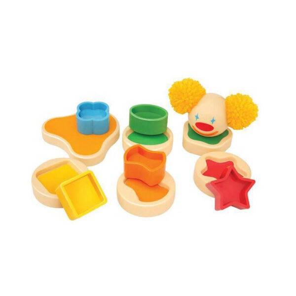 اسباب بازی فکری و آموزشی برج دلقک از قطعات هندسی رنگی به شکل های گل، ستاره، مربع، بیضی و پاپیون و 5 قطعه ی دایره ای که حفره هایی برای جاگذاری قطعات دارد ساخته شده و یک عروسک دلقک زیبا هم همراه این بازی هست که برروی برج قرار میگیرد.
