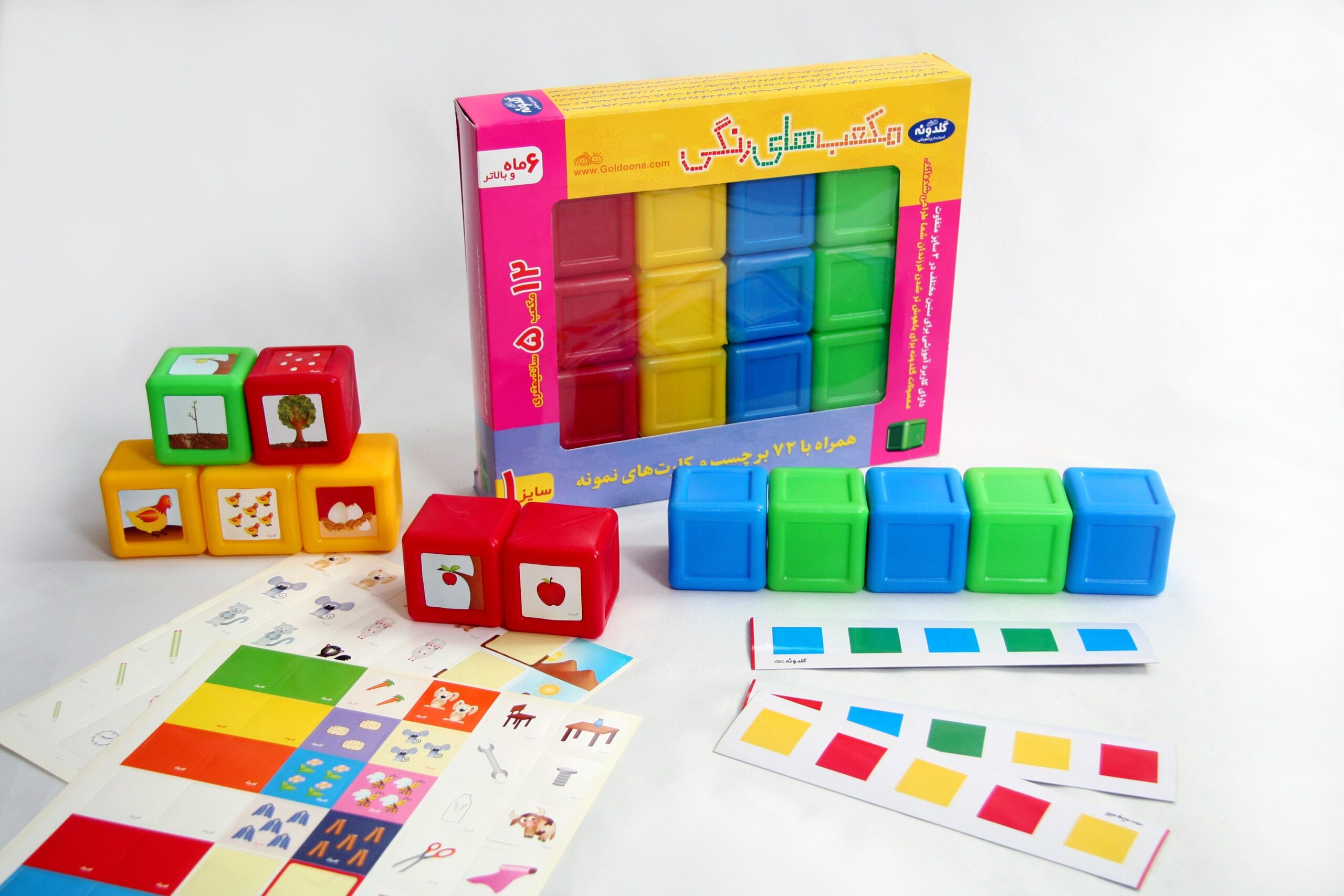 محتویات جعبه: 12عدد بلوک رنگی, برچسب رنگ ها و حیوانات