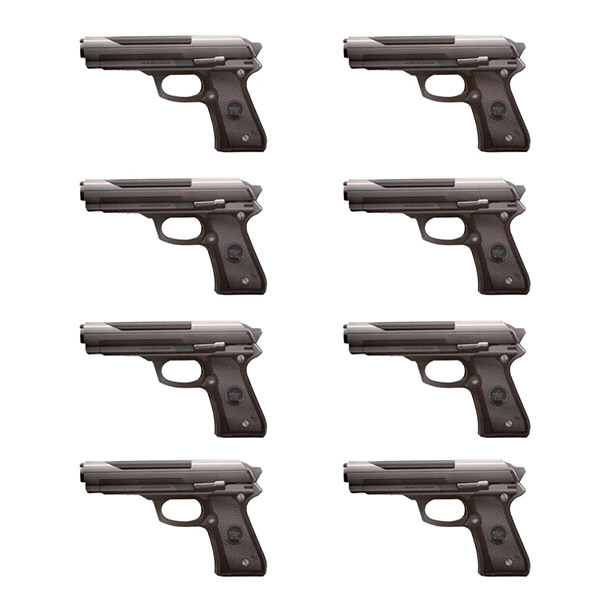 1) کتابچهی قوانین بازی, 2) 8 هفتتیر (از جنس فوم), 3) 18 توکن زخم, 4) 9 پایهی پلاستیکی, 5) 8 کاراکتر (آدمکهای مقوایی), 6) توکنِ رییس جدید – آغازکنندهی بازی, 7) میز مخصوص رییس, 8) کارت الماس ویژه, 9) 16 کارت قدرت, 10) 64 کارت گلوله (40 کارت کلیک! و 24 کارت بَنگ!), 11) 64 کارت سهم |