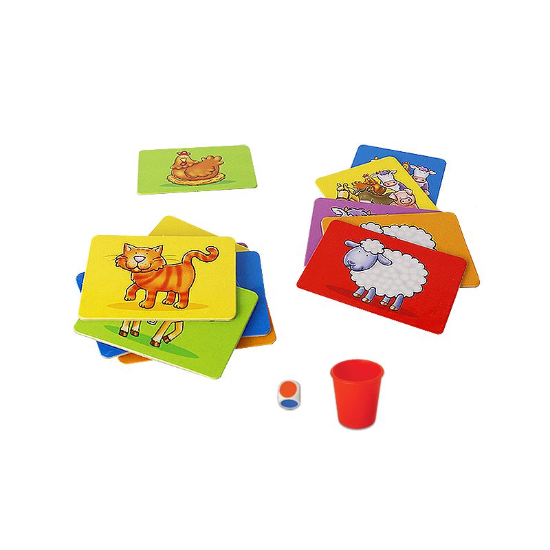 ۳۰ کارت حیوانات، ۱ عدد تاس رنگها، ۱ عدد سطل تاس، راهنمای بازی |
