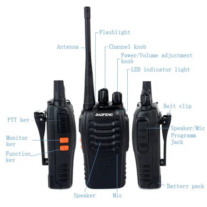 - عملکردها و امکانات: بیسیم واکی تاکی حرفه ای باوفنگ 888s دارای امکاناتی مانند اسکن کانال، CTCSS/DCS (برای کاهش تداخل فرکانسی)، قفل صفحه کلید، چراغ قوه LED و هشدار باتری ضعیف است.
