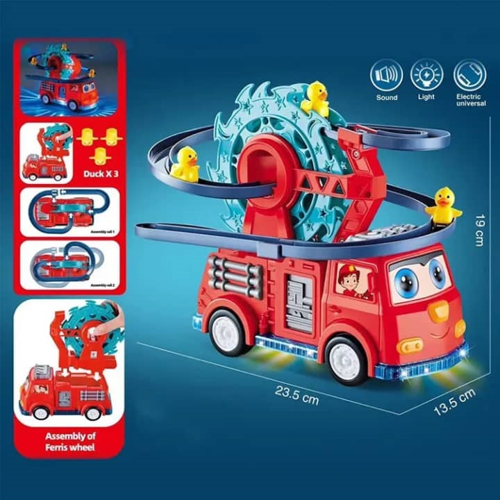 یک اسباب بازی با کیفیت با قیمتی که از کیفیتی تحویل میگیرید پایین تره، این ماشین آتشنشانی هم حرکت داره هم موزیک و رقص نور همچنین اردک ها در همین زمان با گردش در پله ها و سرسره جذابیت و هیجان زیادی برای پسر ۲ ساله من ایجاد میکنه